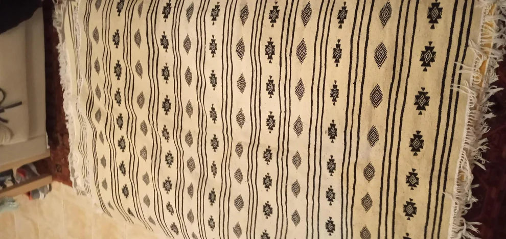 Each rug is handmade by women from the southern Berber villages of Tunisia on a wooden loom. Each rug has a unique size and design, and once sold will be restocked in roughly 6 months time. The rug is made from wool spun from the local sheep in the village and crafted by women who have been carrying this rug-making tradition for hundreds of years. Some rugs have wool which is not dyed but reflects the actual color of the wool. Organic dyes are used for the rest of the rugs.